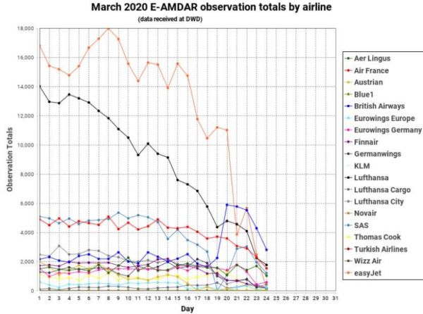 全球 AMDAR 飞机报数量在 2020 年 3 月呈现断崖式下跌。数据由 EUMETNET 提供(图片来源:WMO官网)