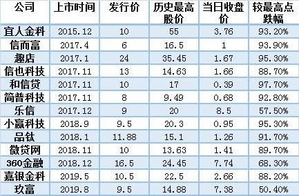 在跌幅方面,和信贷、趣店等7家平台的股价较最高点时已经跌去超过9成,其中和信贷的跌幅最大,为97.7%;趣店和小赢科技次之,为95.3%。值得一提的是,趣店的总市值由当初117亿美元的高点,跌落至如今的4.23亿美元,与罗敏当初定的千亿美元的目标已相去甚远。