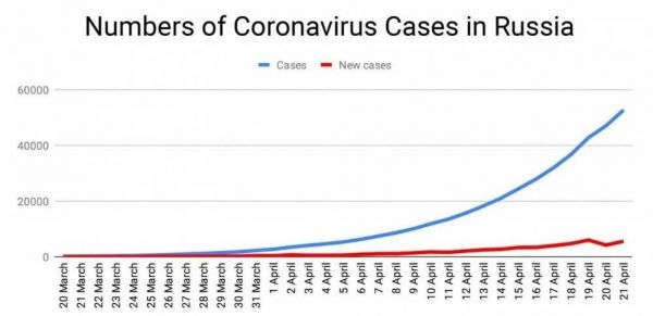 但在接下去的日子里,3月18日,俄罗斯确诊人数破100,3月25日破500,3月27日破1000,4月5日破5000,4月9日破10000,4月20日破50000。