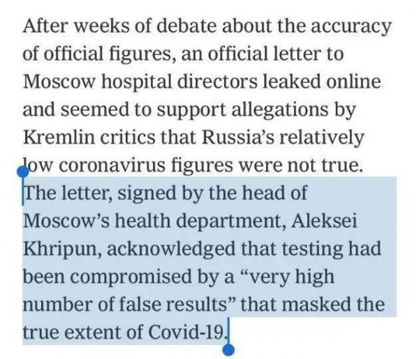 网上流传着一封有莫斯科卫生部门负责人Aleksei Khripun签名的邮件,邮件认为检测中“数量过多的错误结果”掩盖了新冠疫情的真相。