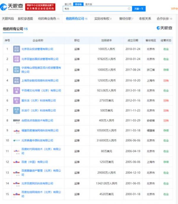截至发稿时,天眼查数据显示,韦方仍在百度系多家公司担任监事一职,其中包括北京百度网讯科技有限公司、百度(中国)有限公司、百度鹏寰资产管理(北京)有限公司等。