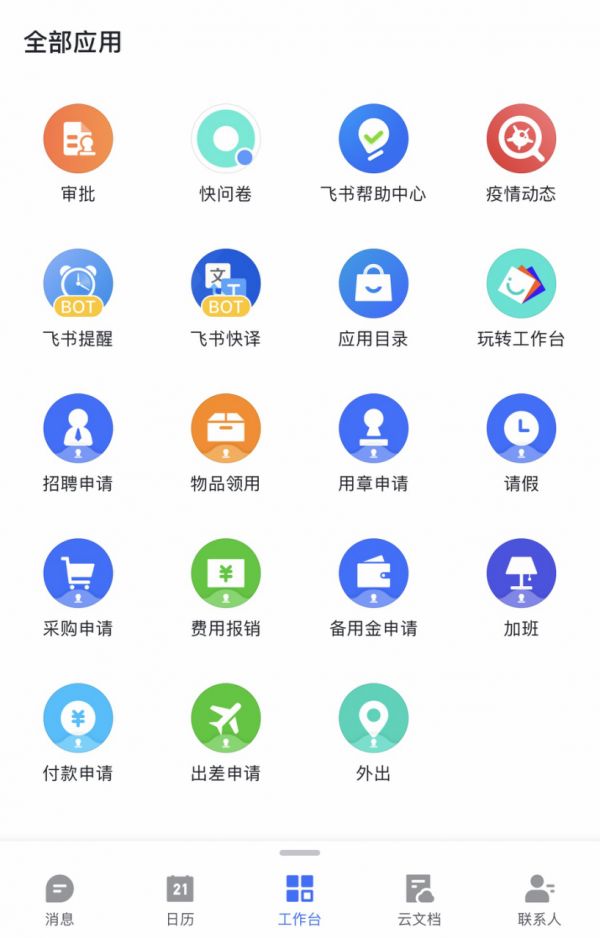 其中,飞书的工作台原本是一个应用集合平台,主要功能包括招聘申请、费用报销、物品领用等,并可直接链接第三方ISV应用以及企业已有系统。