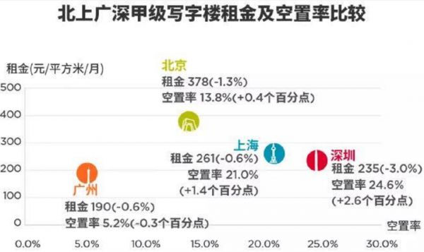 戴德梁行发布报告显示,一季度,北京、上海、深圳甲级写字楼空置率分别上升至13.8%、21%、24.6%,环比分别增加0.3、1.4、4.6个百分点。