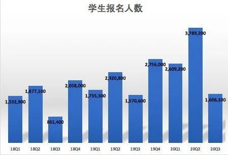 首先,学生报名人数骤减。新东方财报数据数显,新东方2020财年Q3学生报名人数约为160.61万,比二季度的378.92万,较少了218.31万人。