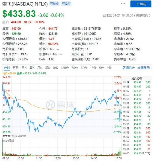 在财报发布后,截止文章发稿,目前奈飞盘后股价为434.60美元,盘后上涨收窄为0.18%,市值为1903.67亿美元。