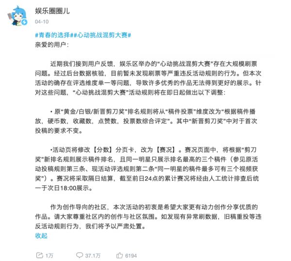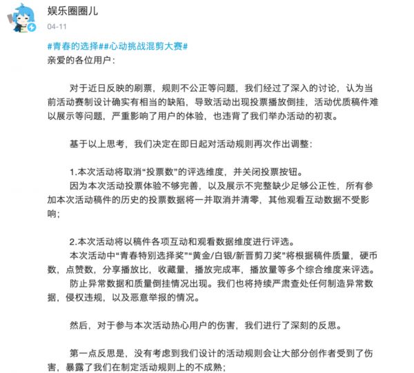 4月11日,B站娱乐区再度出面更改规则: 我们经过了深入的讨论,认为当前活动赛制设计确实有相当的缺陷,导致活动出现投票播放倒挂,活动优质稿件难以展示等问题,严重影响了用户的体验,也违背了我们举办活动的初衷。 基于以上思考,我们决定在即日起对活动规则再次作出调整:1.本次活动将取消“投票数”的评选维度,并关闭投票按钮。2.本次活动将以稿件各项互动和观看数据维度进行评选。同时向粉丝们致歉。