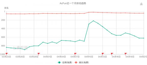 彼之砒霜,吾之蜜糖。B站深陷囹圄,对A站来说可不是坏事。相反,由于一批对于B站氛围的用户出走,来到A站,反倒在阶段性推高了A站的下载量。根据七麦数据显示,在过去的一个月时间内,A站的iOS应用排名恰好处于一个短暂的峰值水平,二者之间是不是巧合,尚难断言。但这并不妨碍A站大张旗鼓地挂出“欢迎回家Acer!”的标语。