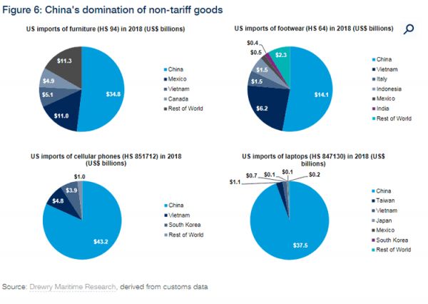 2018 年美国入口的家具和鞋类产品当中,只有约一半来自中国;但手机和笔记本电里,超过 70% 均产自中国。