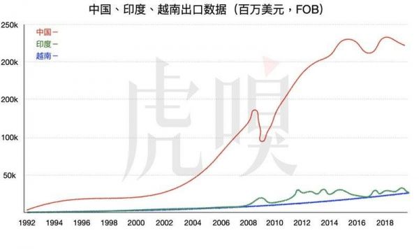 中国、印度、越南三地的出口数据比较,中国出口在2008年前受到一次沉重打击,之后继续向上