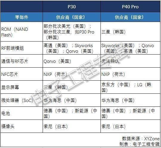 华为 P30 系列 (2019) 和 P40 系列 (2029) 的供应链分布。图片来源:电子工程专辑