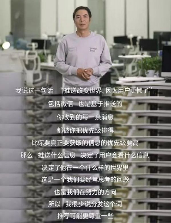 “推送”这件事,张小龙也十分谨慎,他曾在今年的微信公开课上说:“推送什么信息,决定了用户会看什么信息,决定了他在一个什么样的世界里。这是一个我们要经常思考的问题,也是我们在努力的方向。”