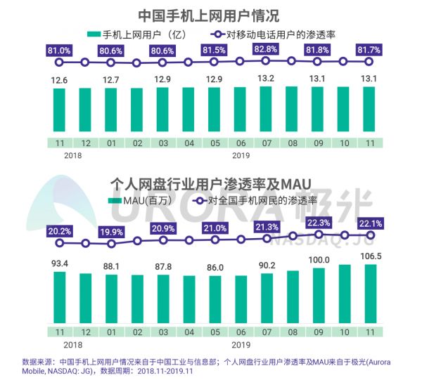 根据极光的《2019年个人网盘行业研究报告》显示,个人网盘行业安装渗透率由2018年11月的20.2%上升至2019年11月的22.1%,增长1.9个百分点;月度活跃用户2019年下半年持续上升,11月达1.065亿。