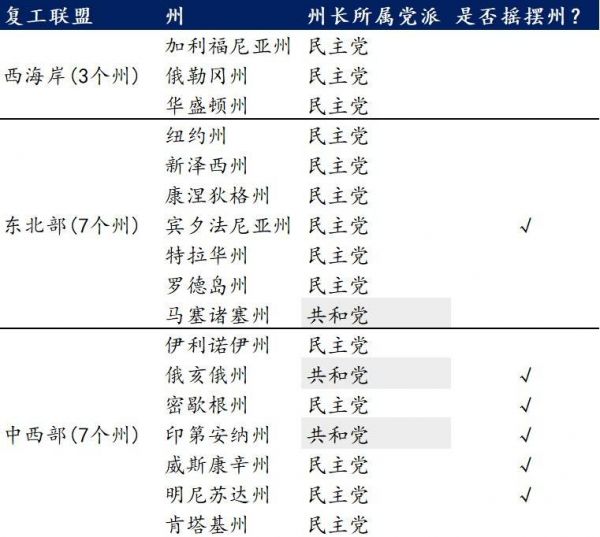 已经各自结盟协调复工的17个州,资料来源:根据新闻整理,国泰君安证券研究
