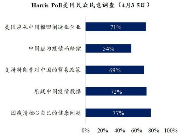 Harris Poll最近的民调数据显示,77%的民众因为疫情担心自己的健康问题,72%质疑中国疫情数据,71%认为美国应从中国撤回制造业企业,69%支持特朗普对中国的贸易政策,54%认为中国应为疫情向各国进行赔偿。