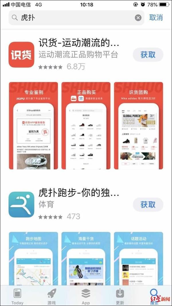 目前在苹果App Store应用商店、安卓应用商店等进行搜索,均无法搜索到虎扑APP,搜索关键词“虎扑”只能出现虎扑旗下另一款应用“识货”。