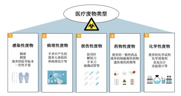 医废共分五类,包含感染性废物、病理性废物、损伤性废物、药物性废物、化学性废物。实际上,医疗废物属于危险废物,因其污染的特殊性,医疗废物分类按照《医疗废物分类目录》执行。