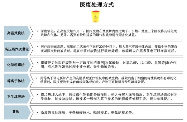 这种“头痛医头、脚痛医脚”的应急解决方式不可持续,不仅可能增加处理人员感染的风险,还存在医废处理不充分造成空气污染的隐患。上世纪70年代,国内就曾发生过由于医废处置不当而出现乙肝流行的事故。因此,在阻断COVID-19病毒的“战线”上,医疗废物处理是“最后一公里”。能否在最后一环防止二次传染,关键看医疗废物处理的速度和手段,而这个行业正经历波澜变化。