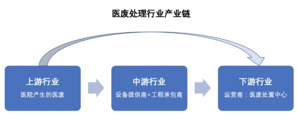 目前国内医废处理的产业链包括上游产生医废的医院、中游的设备提供商和工程承包商,以及下游参与方运营商。其中下游的产业集中度不高,竞争格局分散。数据显示下游上市的龙头企业如东江环保、润邦股份、高能环境、雪浪环境、万邦达、启迪环境、威立雅等,合计处置全行业约10%的产废量。