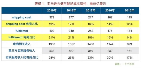 需要说明一下,亚马逊收入结构在财报里被划分成6个部分:1.在线电商;2.实体店(比如Whole Foods超市、Amazon Books书店);3.第三方卖家服务(包括佣金、fulfillment与shipping fee,即使用亚马逊仓配的费用);4.Prime会员订阅;5.AWS;6.其他(主要是在线广告收入)。下面表格1中计算物流的相关费用率,分母里的收入只选择了与电商相关的1和3的总和,非相关的收入没有计算。