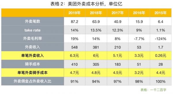 这里根据美团点评年报、招股书做了表格2,主要想看一下它的客单成本,是否体现出规模效应?美团外卖收入结构包括:1.佣金;2.商家投放广告营销;3.商家与消费者支付的配送费。成本结构包括:1.骑手的工资;2.支付通道费;3.客服人员支出;4.设备折旧;5.带宽等。