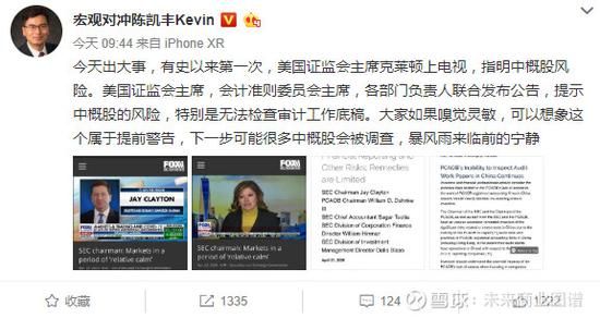“今天出大事,有史以来第一次,美国证监会克莱顿上电视,指明中概股风险。美国证监会、会计准则委员会主席,各部门负责人联合发布公告,提示中概股的风险,特别是无法检查审计工作底稿。大家如果嗅觉灵敏,可以想象这个属于提前警告,下一步可能很多中概股会被调查,暴风雨来临前的宁静。”