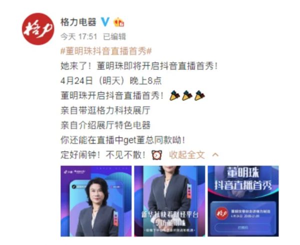 @腾讯网【董明珠开启直播首秀:曾表示坚持线下,不让格力线下销售员工失业】4月23日消息,格力电器官方微博给出的公告称,4月24日晚上8点董明珠开启直播首秀,直播期间她亲自带逛格力科技展厅,亲自介绍展厅特色电器。