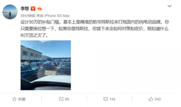 @新浪科技【理想汽车CEO李想:设计30万补贴门槛是精准助攻特斯拉】4月23日晚间消息,理想汽车CEO李想发布微博评价新能源汽车补贴政策,他认为,“设计30万的补贴门槛,基本上是精准的助攻特斯拉来打残国内的纯电动品牌。你只需要换位想一下,如果你是特斯拉,你接下来会如何对策和定价,就知道什么叫灭顶之灾了。”