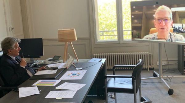 图:苹果首席执行官库克和欧盟专员布雷东举行视频会议