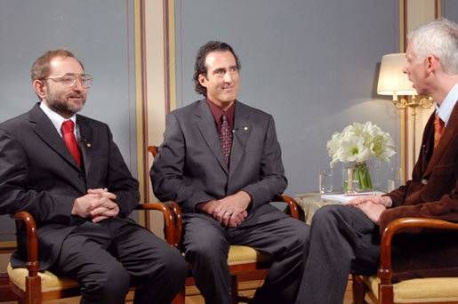 Andrew Fire(左一)和Craig Mello(左二)/ 来源:诺奖官网