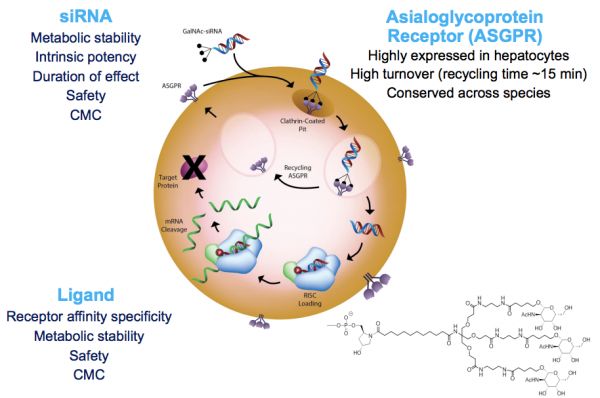 为了增强稳定性,Alnylam还开发了ESC-GalNAc(N-乙酰半乳糖胺,可用于细胞间沟通)递送平台。干扰RNA片段经过GalNAc靶向修饰,可以与干细胞表面的ASGPR(去唾液酸糖蛋白受体)结合,以此进入细胞内部完成递送。