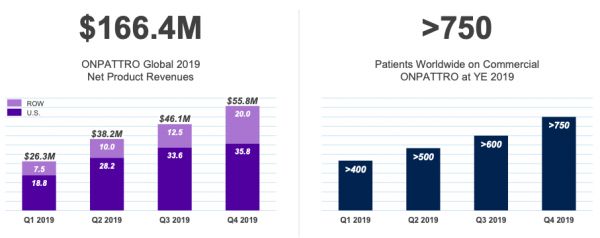 根据Alnylam公开的数据,截至2019年12月,全球受hATTR影响的约5万患者中,已有750人接受了patisiran的治疗。去年全年,该产品累计销售额1.66亿美元。