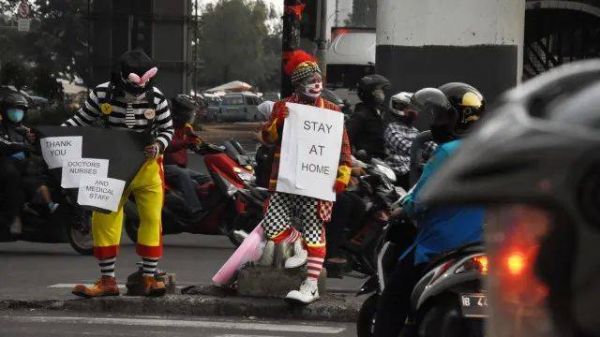 雅加达一个民间社团的演员办成小丑上街宣传宅家抗疫。