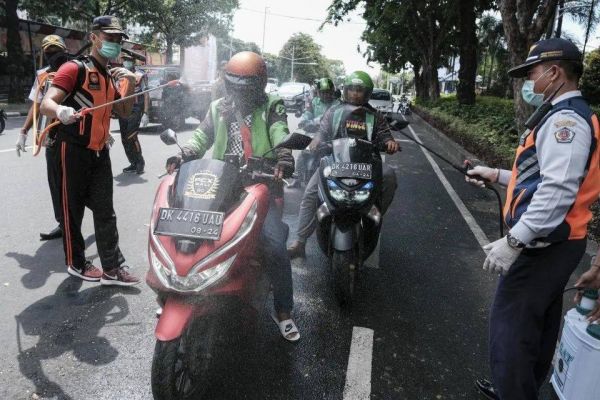 印尼人似乎对消毒水灭病毒的办法情有独钟。在巴厘岛的交通干道上,地方政府也安排了执勤人员往过往行人和车辆上喷洒消毒水。