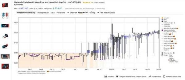 ▲ 3 月份起,美亚上就很难再买到直营的全新 Switch 了,大部分报价都在 500 美元左右,动森同捆机更是可以卖到 750 美元,基本都是原价的两倍多。