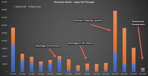 “日本的情况为例,2 月底任天堂发出预警,原版 Switch 销量开始大幅下降,但当时还有 Switch Lite 支撑;之后等到动森游戏上市,再次推高了两个版本的 Switch 销量,但也因供给无法及时跟进,任天堂在 4 月初暂停向日本本土出货,一周后才恢复。”