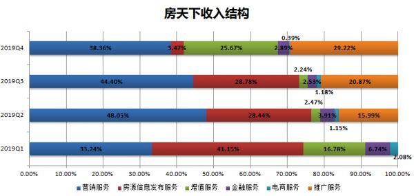 目前房天下的主要业务包括营销服务、房源信息发布服务、增值服务、金融服务、电商服务、推广服务。其中来自营销服务的收入在收入中的占比连续3个季度走低。推广服务于2019年Q2上线,其收入在总营收中的占比变动不断增加。