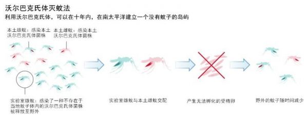 自然界中很多昆虫都携带沃尔巴克氏体,菌株种类也是多种多样。一旦沃尔巴克氏体感染的精子与未感染的卵子结合,它们的受精卵就将无法存活。此外,携带不同菌株的蚊子进行交配,产生的蚊卵也会发育异常,无法孵出幼虫。通常情况下,只要这些注定失败的交配行为达到一定比例,那么一整个区域的蚊子就会灭绝。