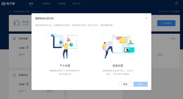 用户需要在官网:www.letsign.com中注册账号,登录成功即可进⼊电⼦牵操作后台,用户首先需要先进实名认证,可以选择“个人认证”或者“企业认证”。