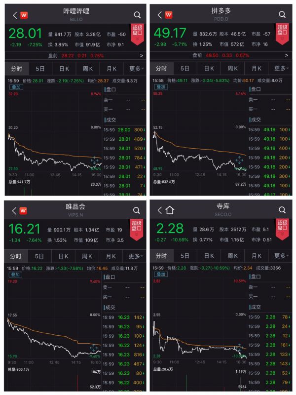4月23日,中概股被无差别集体猎杀,哔哩哔哩大跌7.25%,拼多多大跌5.71%,唯品会大跌7.64%,寺库大跌10.59%,阿里巴巴、京东、百度等中概股也未能幸免,纷纷以下跌收盘。