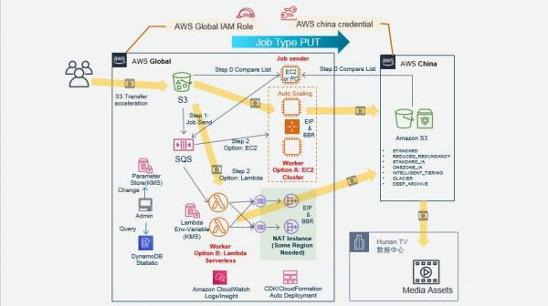 据了解,湖南卫视将MISIA米希亚、萧敬腾和徐佳莹为节目录制的媒资素材上传到歌手所在地的Amazon S3云存储服务中,再利用Amazon EC2弹性计算服务实例或AWS Lambda无服务器技术将素材从海外区域的Amazon S3存储空间回传至由光环新网运营的AWS中国(北京)区域的Amazon S3存储空间。之后,湖南卫视通过专线将位于AWS中国(北京)区域的素材高速下载到本地。在安全性方面,媒资素材传输过程中,数据不写入本地磁盘,分片数据直接在内存完成转发;同时Amazon S3会对静态数据加密。国内段通过专线传输,也保证了数据的安全。