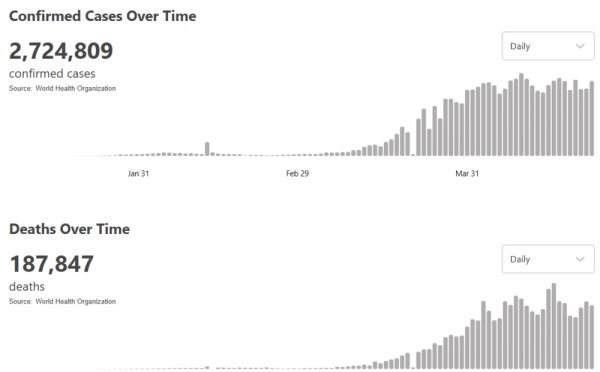 @央视新闻【世卫组织:全球新冠肺炎确诊病例超272万例】根据世卫组织最新实时统计数据,目前全球确诊新冠肺炎病例2724809例,死亡187847例,中国以外约264万例。