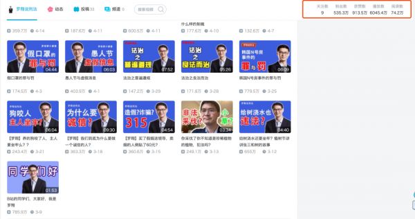 3月9日,罗翔成为一名B站UP主,创造了B站涨粉的最快速度记录,在平台上迅速圈粉超535万,获赞913.5万,首条视频收获了785万的播放数。