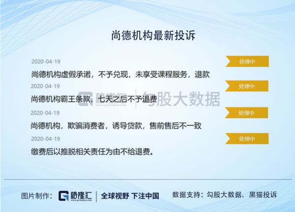 铺天盖地的营销宣传没有相对应的扎实的教学质量和教研水平,难免让用户产生货不对板的抱怨。在黑猫投诉发布的2019年教育培训行业投诉数据中,尚德机构的投诉量将近4000次,位列榜首。实际上,在去年黑猫投诉的年度总结中,尚德机构同样位列投诉数量的榜首。