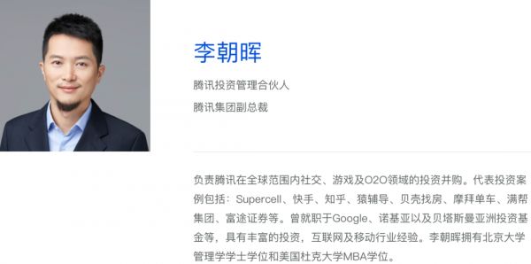 腾讯副总裁李朝晖担任腾讯投资的唯一一位管理合伙人,也是当前公认的腾讯投资“一把手”,其曾为腾讯投资团队成立后的第五名成员。