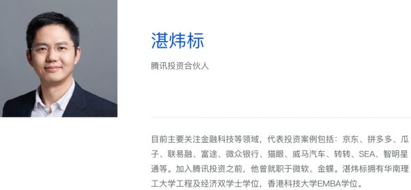 而另一位合伙人为湛炜标。在此之前,湛炜标对外的title主要为“腾讯投资董事总经理”。换言之,湛炜标已正式晋升为合伙人。