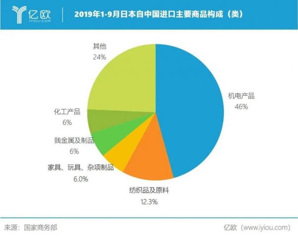 日本从中国进口的主要商品中,机电产品、纺织品及原料和家电、玩具、杂项制品是金额最高的三个细分类别,分别占比45.7%,12.3%和6.0%。