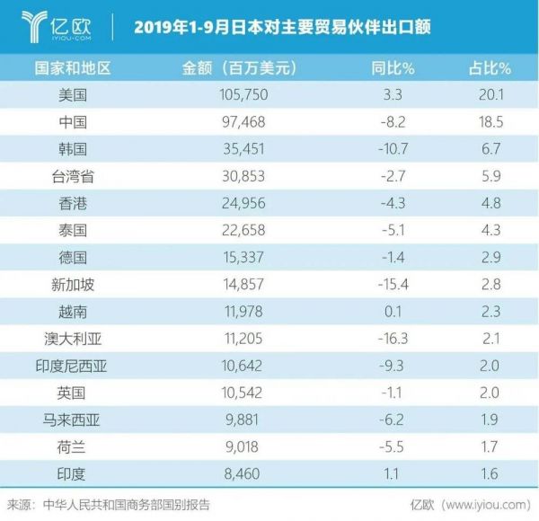 根据国家商务部最新统计数据显示,2019年1月至9月,日本对中国出口的贸易总额都达到974.68亿美元,而日本从中国进口的贸易总额达到1258.47亿美元,中日两国之间的贸易差额达到283.79亿美元,日本为贸易逆差国。