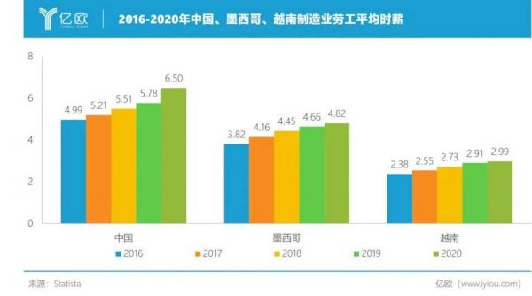 中国制造业劳动成本的增加也必须要考虑的问题。Statista数据显示,2016年至2020年,中国、墨西哥、越南三国制造业劳动的平均时薪对比如上图所示:中国制造业劳动的平均时薪不仅一直在增长,整体水平也远高于另外两个国家。