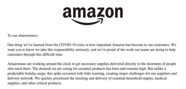 往年的股东信中,关于业务的反思和复盘占一般篇幅最长。而今年信中,几乎全是跟疫情相关的人事安排,更像是亚马逊雇主文化和疫情贡献的展示材料。