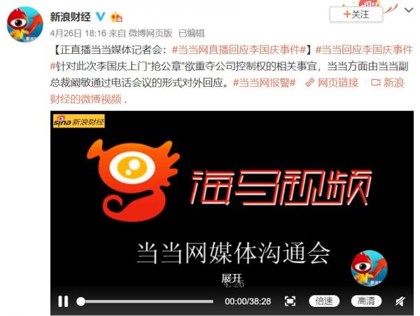 傍晚六点进行的直播记者会上,当当副总裁阚敏表示:李国庆拿走公章声称公司管理权的行为是违法的;公告中提及的临时股东会,没有任何董事收到通知或参与;李国庆多次拒绝和俞渝和解,提出的和解条件也反复变更。